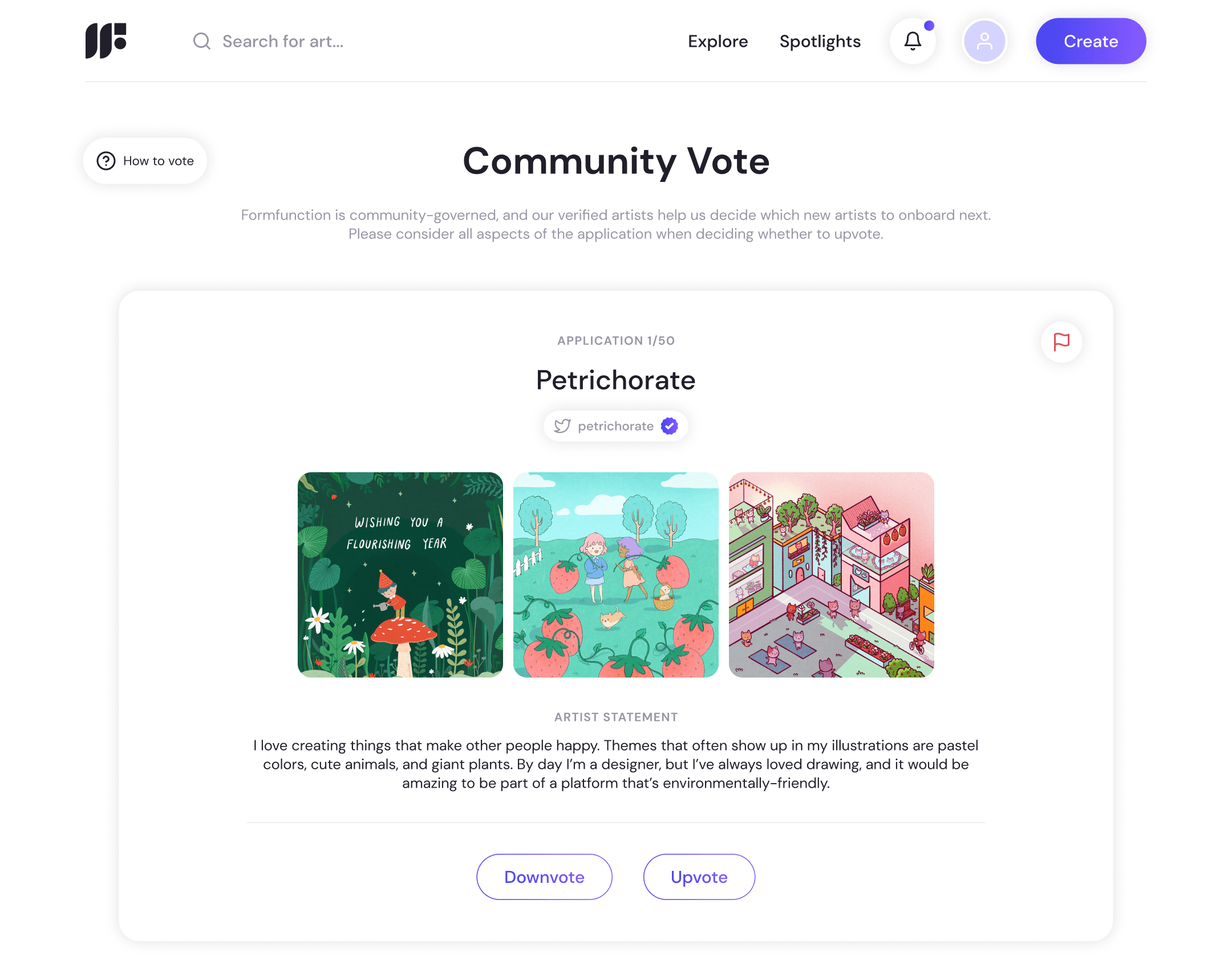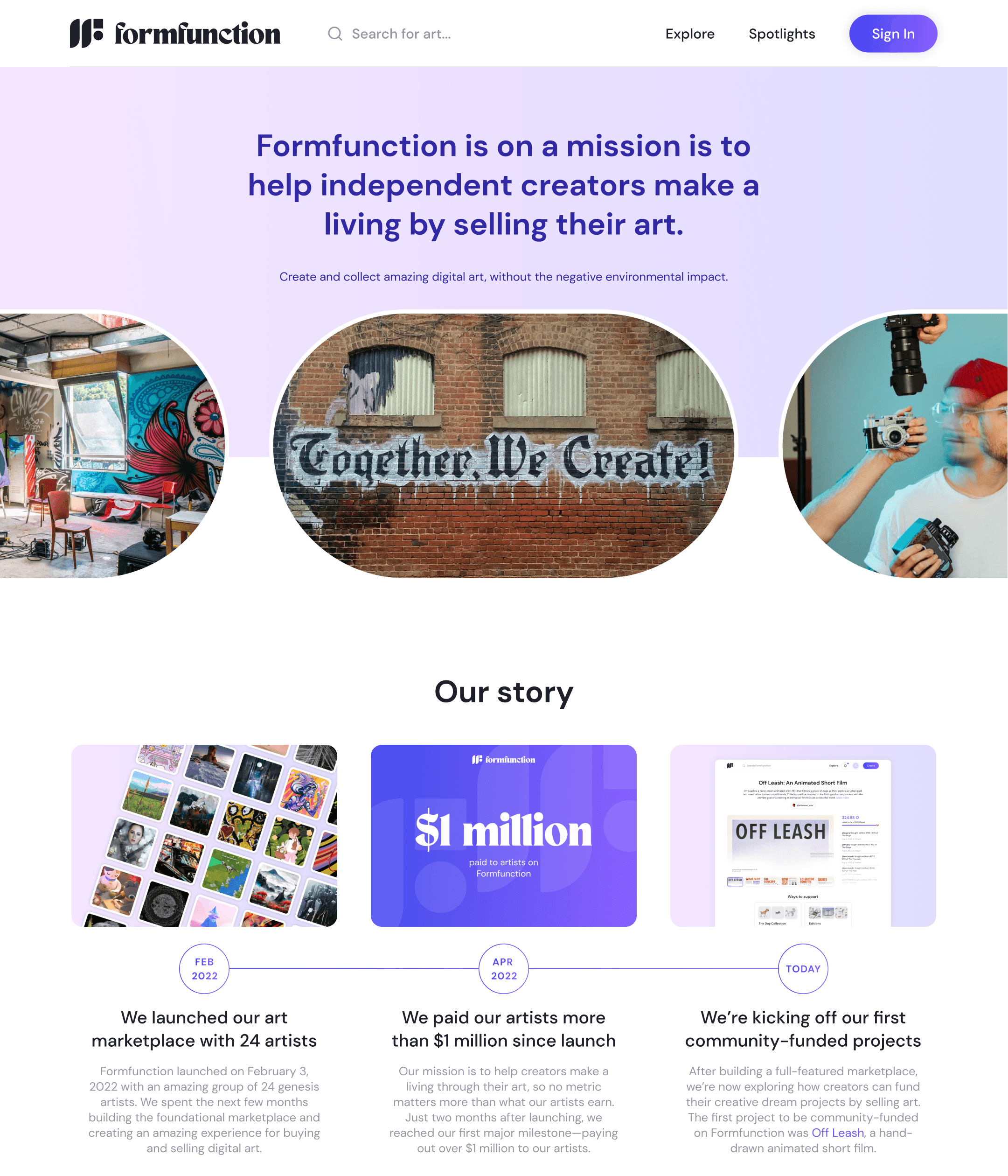 In short, Formfunction was a platform where creators could sell their digital art to collectors. Everything was based on the eco-friendly Solana blockchain, and our mission was to help creators make a living through their digital art. Creators could run auctions for their art pieces, fundraise for longer term projects, and build private communities around their creative work.